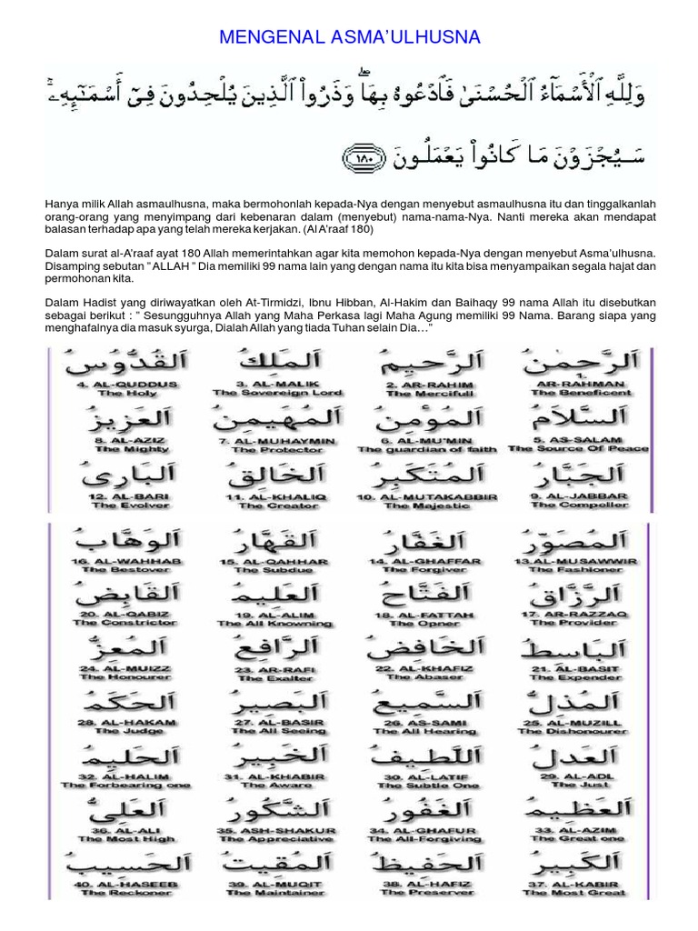 The 99 names of allah. Secara harfiah asmaul husna yaitu nama nama allah yang baik sesuai dengan sifatnya. Download asmaul husna merdu mp3 mishary rashid. Dimana seluruhnya memiliki arti yang baik serta menjadi sifat yang dimiliki oleh allah swt. Yasin, amy search — asmaul husna 04:11. Asmaul husna is a free and awesome books app. Salah satu wujud mengamalkan iman kepada allah yaitu dengan mengetahui, menghafalkan, memahami dan. You are on page 1of 7. Istilah ini hanya diperuntukkan bagi allah taala. Mishary rashid al afasy nama ini sudah tidak asing di telinga kita, ya.beliau adalah setelah anda mendengarkan asmaul husna dalambentuk audio atau file mp3, sekarang akan kami bagikan link download dalam bentuk tulisan atau file pdf. Istilah asmaul husna allah sebutkan artinya: Munif ahmad — asmaul husna 03:33. Puput novel — asmaul husna 05:06.