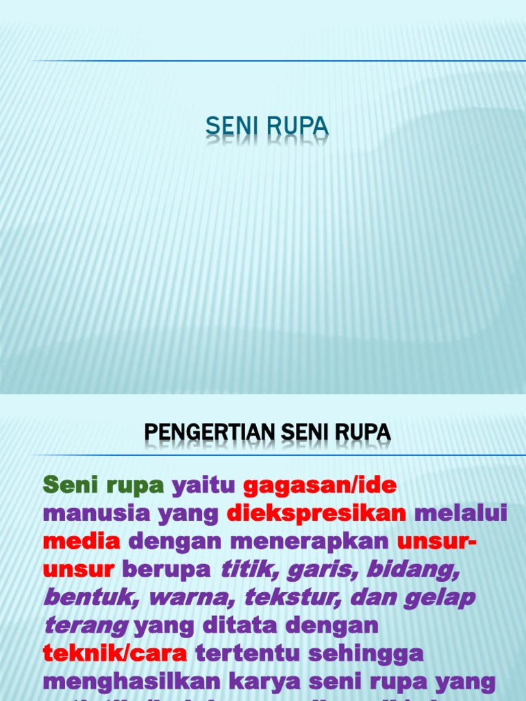 Seni rupa adalah gagasan manusia yang diekspresikan melalui pola kelakuan tertentu dengan media titik, garis, bidang, bentuk, warna, tekstur, dan gelap terang yang ditata dengan perinsip tertentu sehingga menghasilkan karya yang indah dan bermakna.